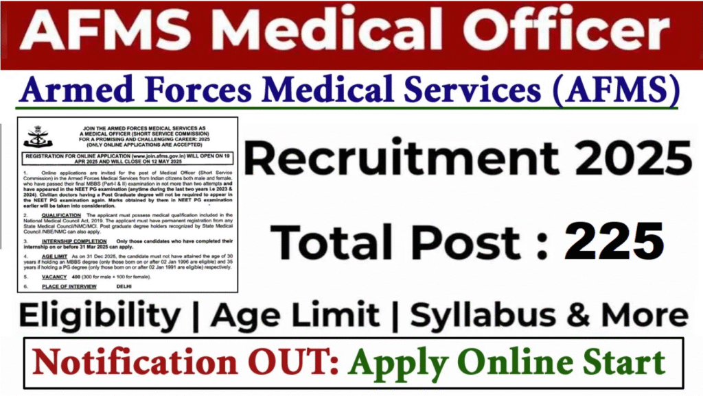 👉 A total of 225 Medical Officer posts are available under AFMS.